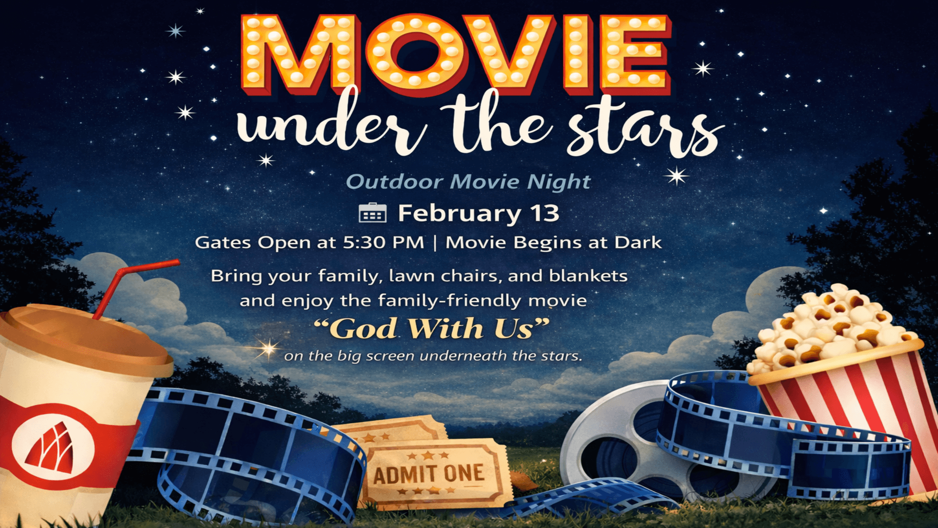 Bring your family, lawn chairs, and blankets. Enjoy the family-friendly movie “God With Us” on the big screen beneath the stars.